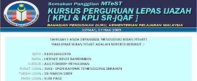 Nota kaki: To Gee..good luck ae..semoga kita sama² dpt jawab..& thanks print kan tiket ujian tu..hehehe~ & to all yg akan menghadiri MTest..good luck too..usaha + tawakal + redha..chewah~