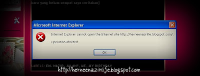 Dari pagi sampai lah ke petang saya tak dapat view blog saya ni.. apa sebabnya pun saya tak tahu.. bila saya view saja keluar lah pesanan khidmat masyarakat dari Microsoft Internet Explorer..entah-entah company ni dah block blog saya kot..huhuhu~kalau di block takkanlah saya boleh update..ye tak? isyhhh..confuse betullah..semalam masa meeting petang.. tiba-tiba boss saya tersebut “I tak nak datang ofis duduk bukak blog” ayat tu memang bukan ditujukan untuk saya..ditujukan untuk practical student di department kami.. tapi saya yang terasa.. hehehe~ berderau darah.. nampaknya boss saya bukanlah buta blog..
