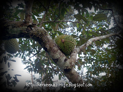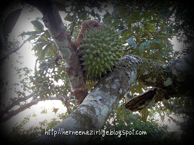 Tengah berjogging En. Nazir terpandang buah durian ni. Maklumlah mata En. Nazir ni senang nampak benda-benda unik lagi ganjil. Bukannya dia redah kebun orang untuk curi durian ye kawan-kawan. Apa yang dia beritahu saya, mula-mula dia ingat buah durian ni tergugur di dahan. Elok je kan kalau betul dia tergugur tu.