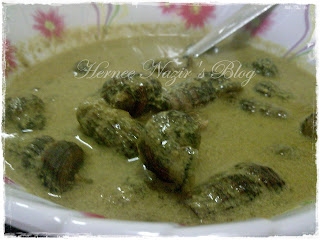 - Masukkan siput sedut ke dalam periuk dan masukkan sedikit santan cair dan bahan2 yang di blender tadi. Tak dilupakan sebatang serai.