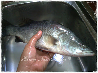 Malam Sabtu lepas terjumpa adik best friend masa sekolah2 dulu kat kedai. Kat tangan dia menjinjit ikan siakap ada la dalam 3 4 ekor. Sekali dengan murah hatinya dia bagi kami sekor ikan siakap. Rezekikan, boleh tahan besarnya. Last week dah masak siakap stim untuk emak, jadi kali ni masak kat rumah sendiri pula. Fikir punya fikir apa nak dimasak ek. Nak masak sweet sour or tiga rasa macam dah selalu sangat. Last2 saya bakarkan je.