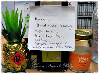 Sebelum dia bercuti, sempat dia tinggalkan pesanan atas meja beserta bird nest and vinegar apple honey.