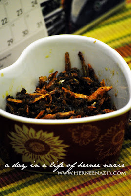 En. Nazir suruh buat Sambal Ketuk, jadi petang semalam gigihlah saya mengetuk2 di dapur ala2 Ketuk-ketuk Ramadhan hehehe. Cili padi punya la banyak saya letak tapi sikit pun tak pedas.