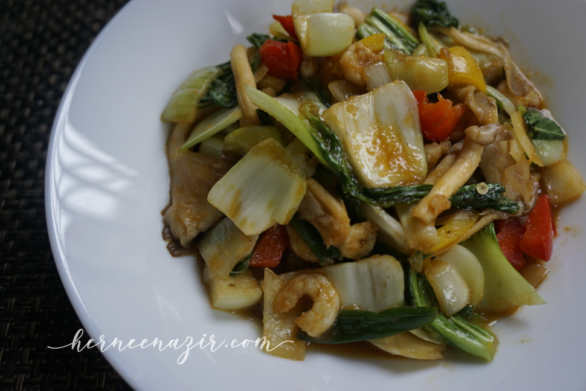 Mixed Vege.. dalam tu ada udang, cendawan, bak choi, capsicum, daung bawang, petola. Ummi tumis bawang kisar (bawang besar dan bawang putih), masukkan sos samyeang, masukkan udang dan sayur-sayuran.