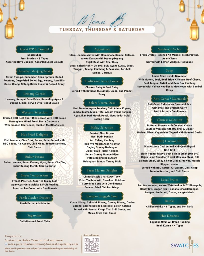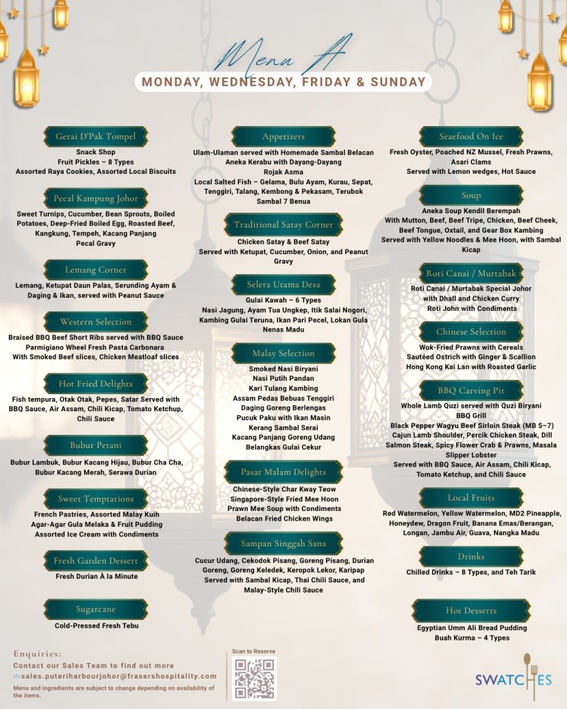 @herneenazir ✨🌙NUSANTARA RAMADAN AT FRASER PLACE PUTERI HARBOUR ✨🌙 📆  23 Feb – 20 Mar 2026 🕡 6.30pm – 10.00pm 📍 Swatches Restaurant, Fraser Place Puteri Harbour Dalam video ni hanya sebahagian sahaja menu yang bakal disajikan sepanjang Ramadan iaitu Beef Rendang Kampong, Ayam Bakar Perchik Santan, Udang Masak Sambal Petani, Sayur goreng Jawa, Serunding Daging & Ayam, Ketupat Daun Palas, Lemang Pulut. Jangan lupa cuba menu "Selera Utama Desa" antaranya Gulai Kawah (6 jenis), Belangkas Gulai Cekur, Lokan Gulai Nenas Madu, Ayam Tua Ungkep, Itik Salai Nogori, Nasi Jagung, Kambing Gulai Teruna, Ikan Pari Pecel, Daging Goreng Berlengas, Asam Pedas Bebuas Tenggiri, Western Food, Chinese Food, Aneka Kuih muih moden dan tradisional dan banyak lagi. Paling dinanti²kan, jangan lupa ada stall durian ok. 💸 𝗛𝗔𝗥𝗚𝗔 𝗕𝗜𝗔𝗦𝗔 Dewasa – RM188+ Kanak² (6-12 tahun) & Warga Emas (60 tahun ke atas) – RM98+ 📩 Untuk tempahan, sila hubungi: sales.puteriharbourjohor@frasershospitality.com​ #FraserPlacePuteriHarbour #FrasersHospitality #FraserMoments #NusantaraRamadhan #RamadanBuffet ♬ Marhaban Ya Ramadan – TonsTone